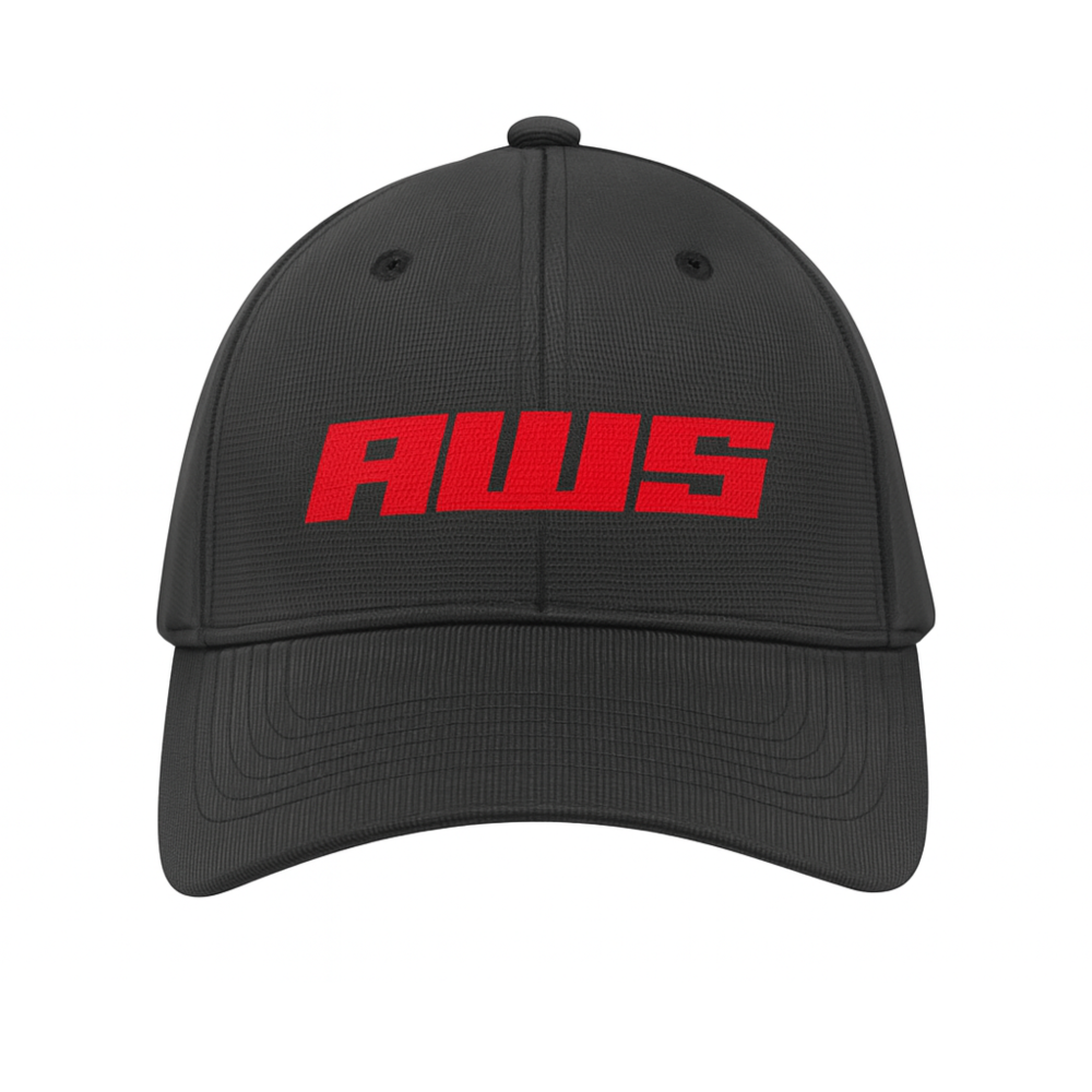 شعار AWS مطرز باللون الأحمر الجريء في مقدمة القبعة – يعكس القوة والانتماء.